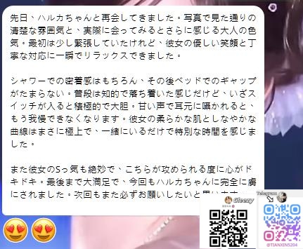 また彼女のSっ気も絶妙で、こちらが攻められる度に心がドキドキ。最後まで大満足で、今回もハルカちゃんに完全に虜にされました。次回もまた必ずお願いしたいと思います。
